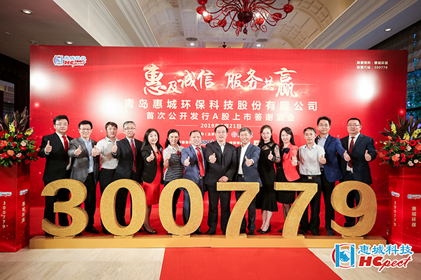 5月22日上午,青島惠城環保科技股份有限公司上市儀式在深圳證券交易所東門8樓大廳正式啟動。青島市地方金融監管局副局長王偉光、青島惠城環保科技股份有限公司董事長張新功、中德證券有限責任公司首席執行官段濤致辭,隨著開市寶鐘的敲響,惠城環保正式上市。