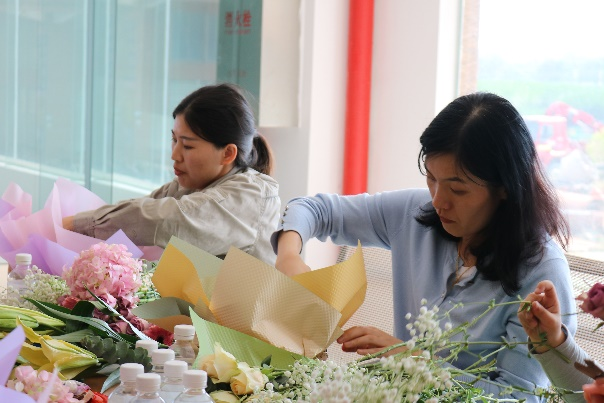 在由玫瑰花、洋桔梗、繡球花、百合、滿天星之香氣調(diào)和而成的陣陣馨香中,花藝師向女職工們講解插花知識(shí),介紹花材的名稱、養(yǎng)護(hù)方案、花材的處理和修剪方法,示范插花步驟,女職工們聚精會(huì)神地學(xué)習(xí)后認(rèn)真設(shè)計(jì)自己的花籃,相互討論,時(shí)不時(shí)迸發(fā)出爽朗的笑聲,經(jīng)過(guò)精心設(shè)計(jì),一個(gè)個(gè)形態(tài)飽滿、充滿生命力的花籃就誕生了,大家紛紛拿出手機(jī),記錄下這美好的時(shí)刻。